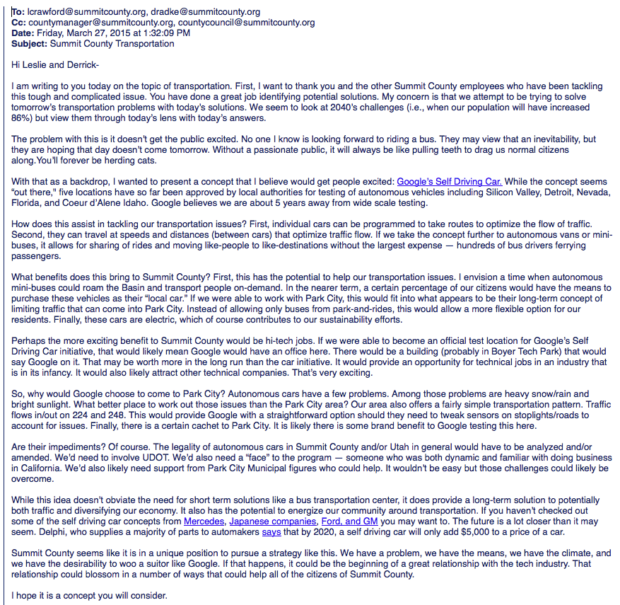 With that in mind, late last week we wrote to our Summit County Engineer with a suggestion: Pursue self driving cars and more importantly pursue Google.