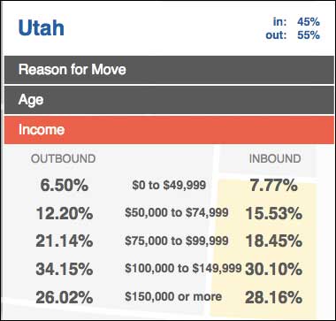 Each year, United Van Lines publishes a migration study between states. This is helpful because while the government provides good population given census data, other years are just estimates. The United Van Lines study also provides data on what demographics are moving, which is helpful. So, what does Utah migration look like in 2015, according to United Van Lines Data? In the graphics below, you’ll see that the moving company’s data shows people are leaving Utah.